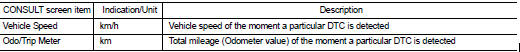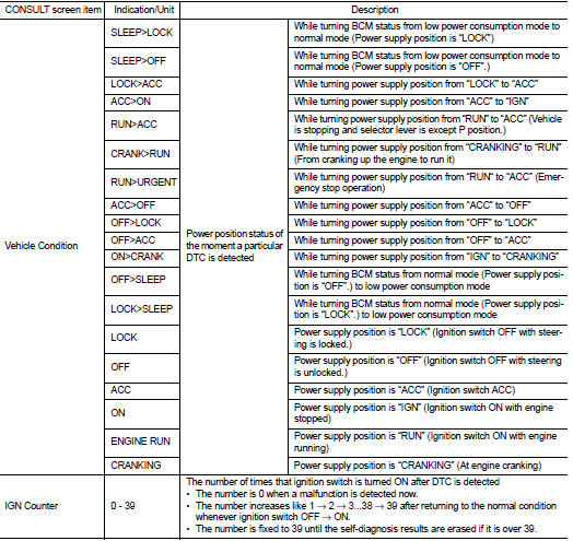 The BCM records the following vehicle condition at the time a particular DTC is detected, and displays on CONSULT-III.