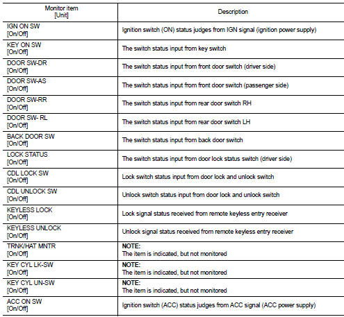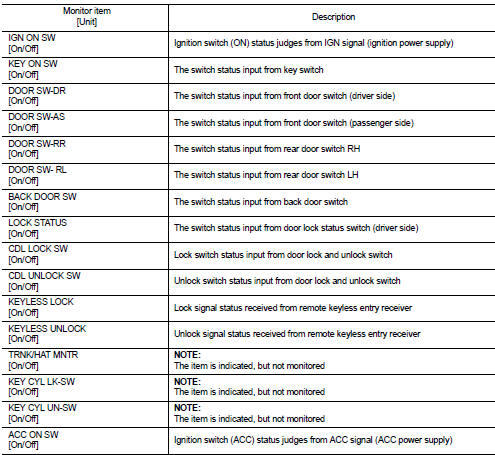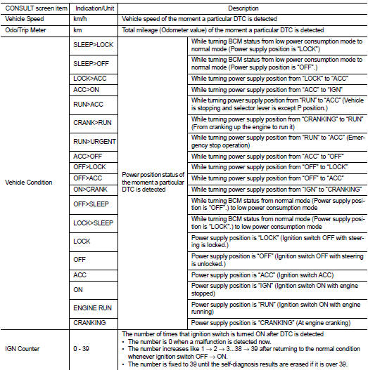 The BCM records the following vehicle condition at the time a particular DTC is detected, and displays on CONSULT-III.