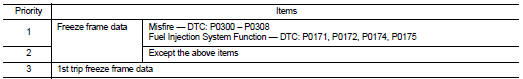 For example, the EGR malfunction (Priority: 2) was detected and the freeze frame data was saved in the 2nd trip. After that when the misfire (Priority: 1) is detected in another trip, the freeze frame data will be updated from the EGR malfunction to the misfire. The 1st trip freeze frame data is updated each time a different malfunction is detected. There is no priority for 1st trip freeze frame data. However, once freeze frame data is stored in the ECM memory, 1st trip freeze data is no longer stored (because only one freeze frame data or 1st trip freeze frame data can be stored in the ECM). If freeze frame data is stored in the ECM memory and freeze frame data with the same priority occurs later, the first (original) freeze frame data remains unchanged in the ECM memory.