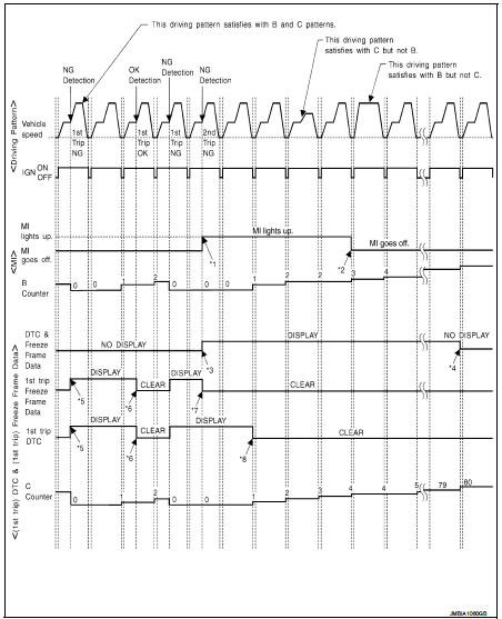 *8: 1st trip DTC will be cleared when vehicle is driven once (pattern C) without the same malfunction after DTC is stored in ECM.