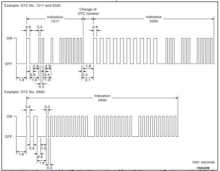 A change from one trouble code to another occurs at an interval of 1.8-seconds OFF.