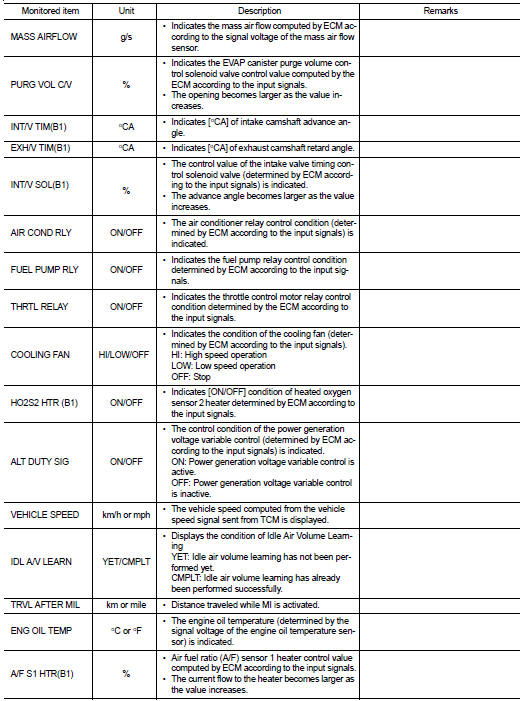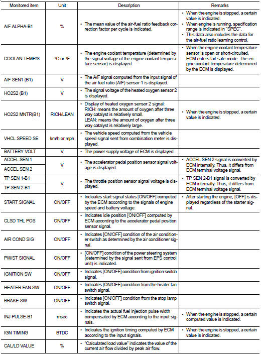 The ECM records the driving conditions such as fuel system status, calculated load value, engine coolant temperature, short term fuel trim, long term fuel trim, engine speed, vehicle speed, absolute throttle position, base fuel schedule and intake air temperature at the moment a malfunction is detected.