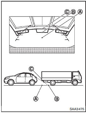 Backing up behind a projecting object The position C is shown further than the position B in the display. However, the position C is actually at the same distance as the position A . The vehicle may hit the object when backing up to the position A if the object projects over the actual backing up course.