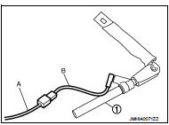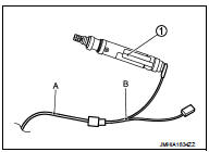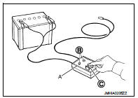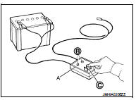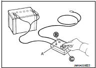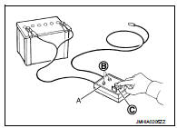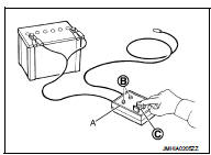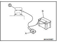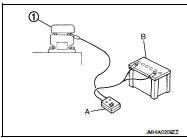 5. Connect red clip of deployment tool (SST: KV99106400) (A) to battery positive terminal and black clip to negative terminal (B).