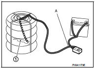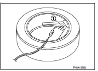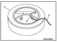 4. Put the inflator (1) connected with the deployment tool (A) (SST: KV99106400) and deployment tool adapter (B) (SST: KV99110500) into a tire without a wheel (C).