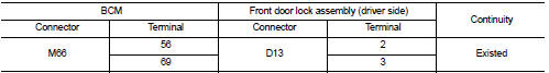 2. Check continuity between BCM harness connector and front door lock assembly (driver side) harness connector
