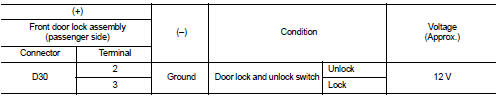 3. Check voltage between front door lock assembly (passenger side) harness connector and ground.