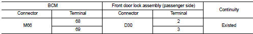2. Check continuity between BCM harness connector and front door lock assembly (passenger side) harness connector.