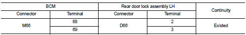 2. Check continuity between BCM harness connector and rear door lock assembly LH harness connecto