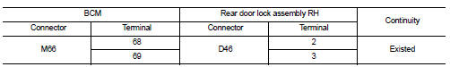 2. Check continuity between BCM harness connector and rear door lock assembly RH harness connector.
