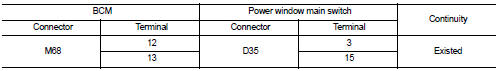 2. Check continuity between BCM harness connector and power window main switch harness connector.
