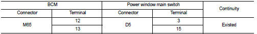 2. Check continuity between BCM harness connector and power window main switch harness connector.