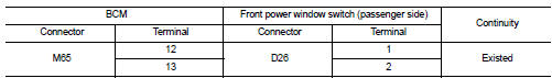 2. Check continuity between BCM harness connector and front power window switch (passenger side) harness connector.