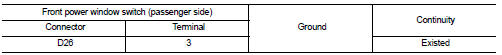 Check continuity between front power window switch (passenger side) harness connector and ground.