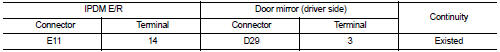 2. Check continuity between IPDM E/R harness connector and door mirror (driver side) harness connector.