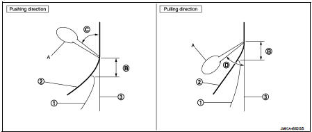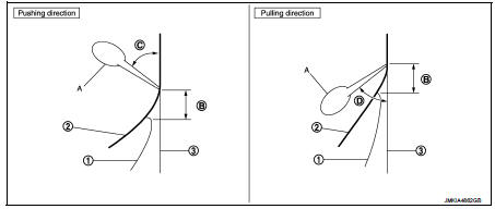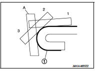 3. For small radius portion of hemming part, gradually apply pressure and affix door sash tape (1) using squeegee (A) in 1 – 3 steps.