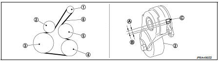 • Check that the indicator (C) (notch on fixed side) of drive belt auto-tensioner is within the possible use range (A) in the figure.