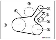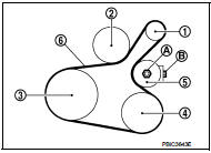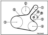 3. Adjust drive belt tension by turning the adjusting bolt (B). Refer to EM-154, "Tension Adjustment".