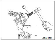 7. Remove drive pinion assembly (1) from transfer case while tapping the drive pinion lightly with a plastic hammer.
