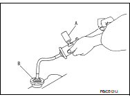 • To check for leakage, apply pressure to the cooling system with the radiator cap tester (commercial service tool) (A) and the radiator cap tester adapter (commercial service tool) (B).