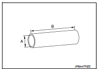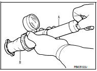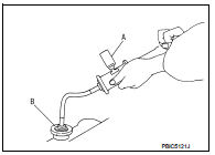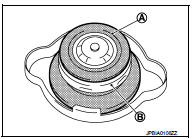 To check for leakage, apply pressure to the cooling system with the radiator cap tester (commercial service tool) (A) and the radiator cap tester adapter (commercial service tool) (B).