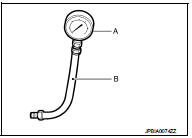 3. Install oil pressure gauge [SST: ST25051001 (J-25695-1)] (A) and hose [SST: ST25052000 (J-25695-2)] (B).