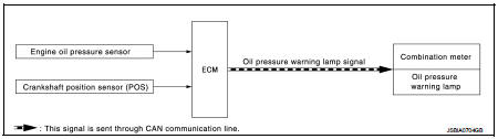 • When detecting a decrease in engine oil pressure at an engine speed less than 1,000 rpm, ECM transmits an oil pressure warning lamp signal to the combination meter.The combination meter turns ON the oil pressure warning lamp, according to the signal.