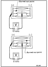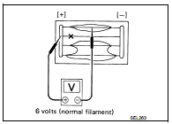 2. Attach probe circuit tester (in Volt range) to middle portion of each filament.