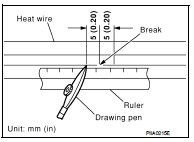 3. Place ruler on glass along broken line. Deposit conductive silver composition on break with drawing pen. Slightly overlap existing heat wire on both sides [preferably 5 mm (0.20 in)] of the break.