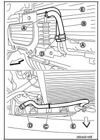6. Remove hose clamps (D) and fluid cooler hose C (E).