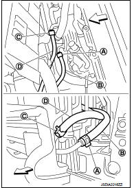 10. Remove clamps (C) and fluid cooler hose A (D).