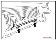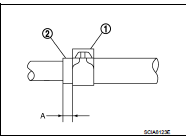 - Set hose clamps (1) at the both ends of CVT fluid cooler hoses (2) with dimension “A” from the hose edge.