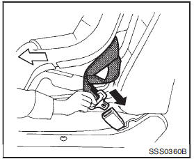 4. Pull the shoulder belt until the belt is fully extended. At this time, the seat belt retractor is in the Automatic Locking Retractor (ALR) mode (child restraint mode). It reverts to Emergency Locking Retractor (ELR) mode when the seat belt is fully retracted.