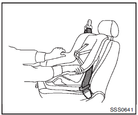 8. After attaching the child restraint, test it before you place the child in it. Push it from side to side while holding the child restraint near the seat belt path. The child restraint should not move more than 1 inch (25 mm), from side to side. Try to tug it forward and check to see if the belt holds the restraint in place. If the restraint is not secure, tighten the seat belt as necessary, or put the restraint in another seat and test it again.