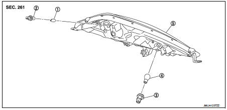 1. Parking lamp bulb 2. Parking lamp bulb socket 3. Front turn signal lamp bulb socket 4. Front turn signal lamp bulb 5. Front combination lamp housing