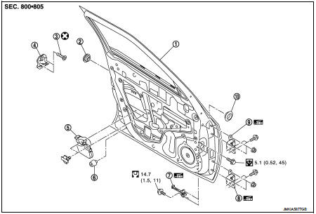 3. Remove door hinge mounting bolts (door side), and then remove door assembly.