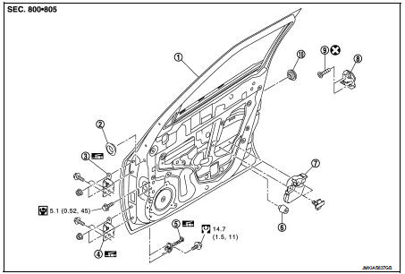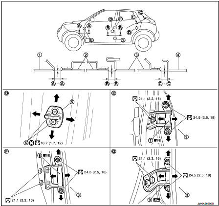 • After installation, perform the fitting adjustment. Refer to DLK-454, "DOOR ASSEMBLY : Adjustment".