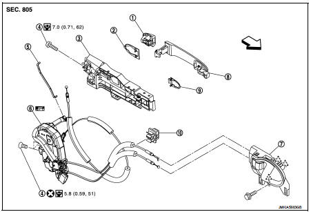 7. While pulling outside handle, remove door key cylinder assembly (diver side) or outside handle escutcheon (passenger side).