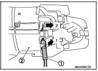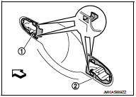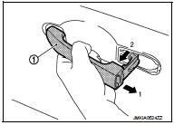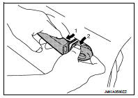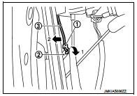 3. Disengage inside handle (1) from door panel (2) while sliding inside handle toward vehicle rear, and then separate inside handle.