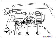 5. Disconnect harness connector of door antenna (1) and door request switch (2) and remove harness clamp (3).
