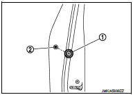 6. Remove grommet (1) of door side. Loosen, through grommet hole, TORX bolt (2) that fixes door lock cylinder. (For passenger side, TORX bolt fixes outside handle escutcheon.)