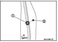 4. Remove grommet (1) of door side. Loosen, through grommet hole, TORX bolt (2) that fixes door lock cylinder. (For passenger side, TORX bolt fixes outside handle escutcheon.)