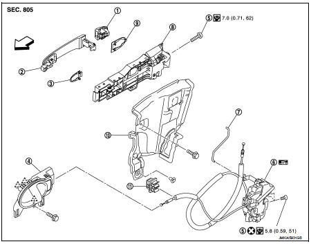 3. Remove outside handle bracket. Refer to DLK-474, "OUTSIDE HANDLE : Removal and Installation".
