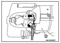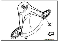 3. Disengage inside handle (1) from door panel (2) while sliding inside handle toward vehicle rear, and then separate inside handle.