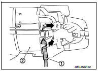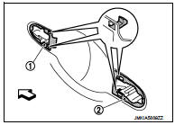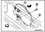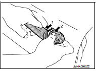 3. Disengage inside handle (1) from door panel (2) while sliding inside handle toward vehicle rear, and then separate inside handle.