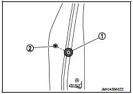 5. Remove grommet (1) of door side. Loosen, through grommet hole, TORX bolt (2) that fixes door lock cylinder. (For passenger side, TORX bolt fixes outside handle escutcheon.)