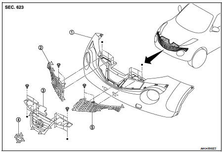 3. Disengage fixing pawls from back side while pulling front center grille to wade vehicle front, and then remove front center grille.