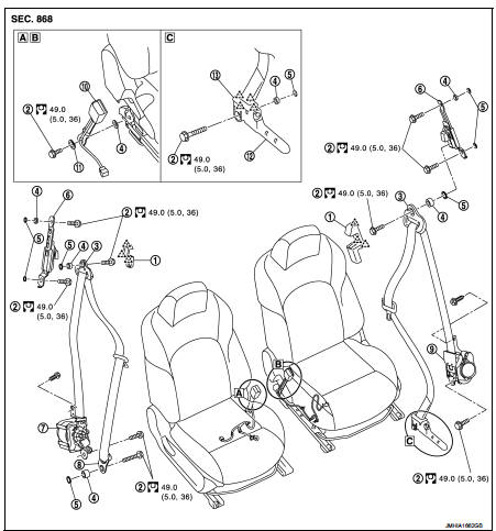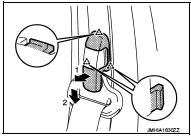 1. Remove center pillar upper garnish. Refer to INT-21, "CENTER PILLAR UPPER GARNISH : Removal and Installation".