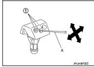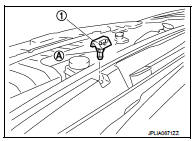 3. While pressing pawl (A) on the cowl top cover front side of front washer nozzle (1), remove front washer nozzle from cowl top cover.
