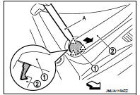 3. Disengage front wiper arm cap (1) fixing pawls with a remover tool (A), and then remove front wiper arm cap from the wiper arm (2).